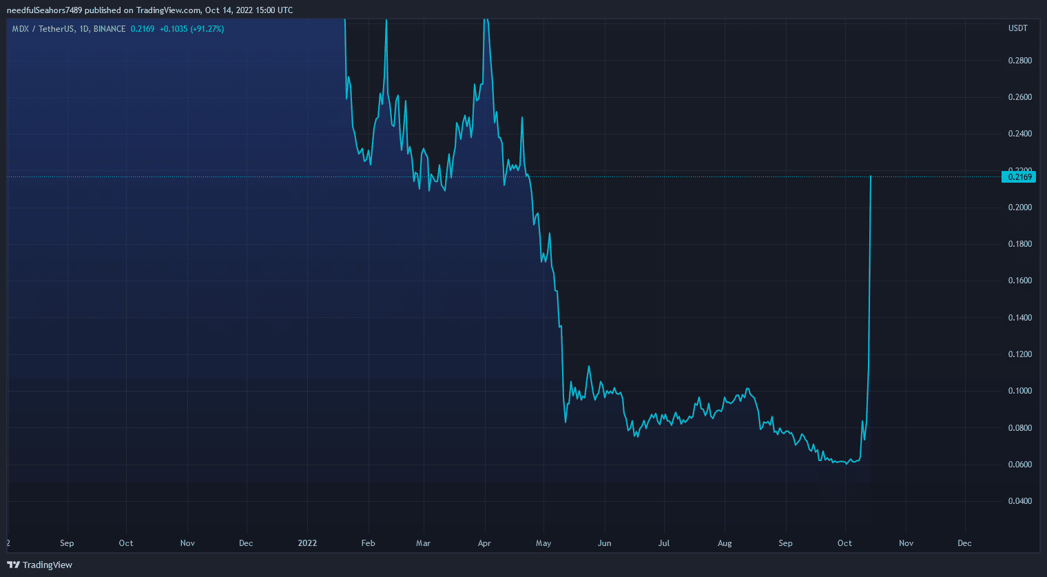 Za tento týždeň si kryptomena MDX pripísala vyše 300 % (307 %). Ide o decentralizovaný burzový protokol, ktorý sa špecializuje na lepšiu škálovateľnosť. Len za niekoľko dní investori vystrelili cenu tokenu MDX astronomicky vysoko, ako môžete vidieť na grafe nižšie. Token je možné nakúpiť na burze Binance a v čase písania článku sa obchoduje za 0,2124 dolára.
