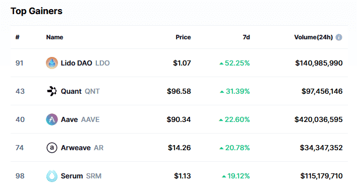 Tretím v poradí v rebríčku ziskových kryptomien z top 100 je decentralizovaný finančný protokol Aave, ktorý umožňuje ľuďom požičiavať a vypožičiavať si kryptomeny. Token AAVE poskytuje držiteľom zľavnené poplatky na platforme a slúži aj ako token pre správu – dáva majiteľom možnosť podieľať sa na budúcom vývoji protokolu. Token narástol o 22,6 % a obchoduje sa za 90 dolárov.