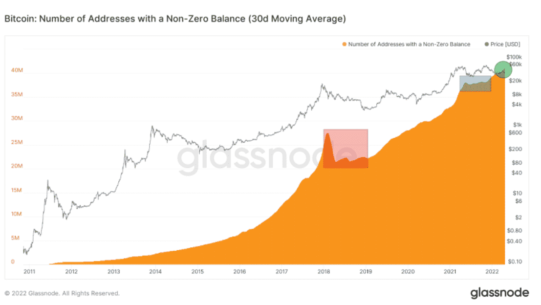 V súčasnosti indikátor nastavuje nové ATH každý deň. 19. apríla 2022 bol počet adries s nenulovým zostatkom 41 243 796 (zelený kruh). Toto je ďalší argument pre dynamický rast a silné základy siete.