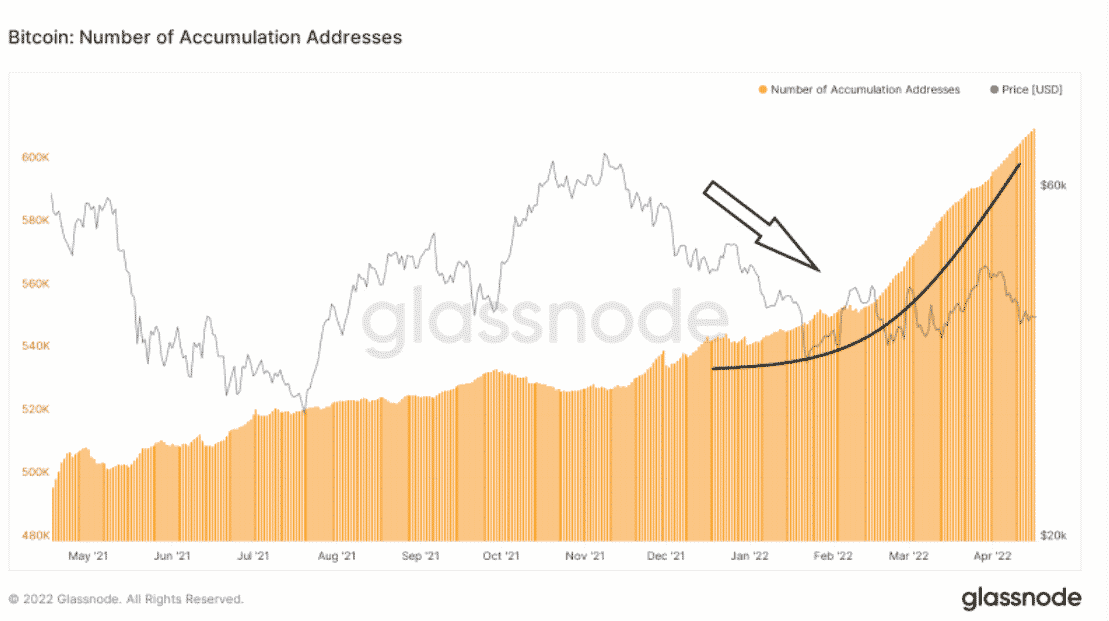 Na grafe počtu adries akumulácie, ktorý siaha až do mája 2021, tiež vidíme pomerne monotónny vzostupný trend. Od polovice februára 2022 sa však – napriek poklesu ceny BTC (šípka) – rast počtu akumulačných adries rapídne zrýchlil a rastová krivka sa zostrila (čierna čiara).