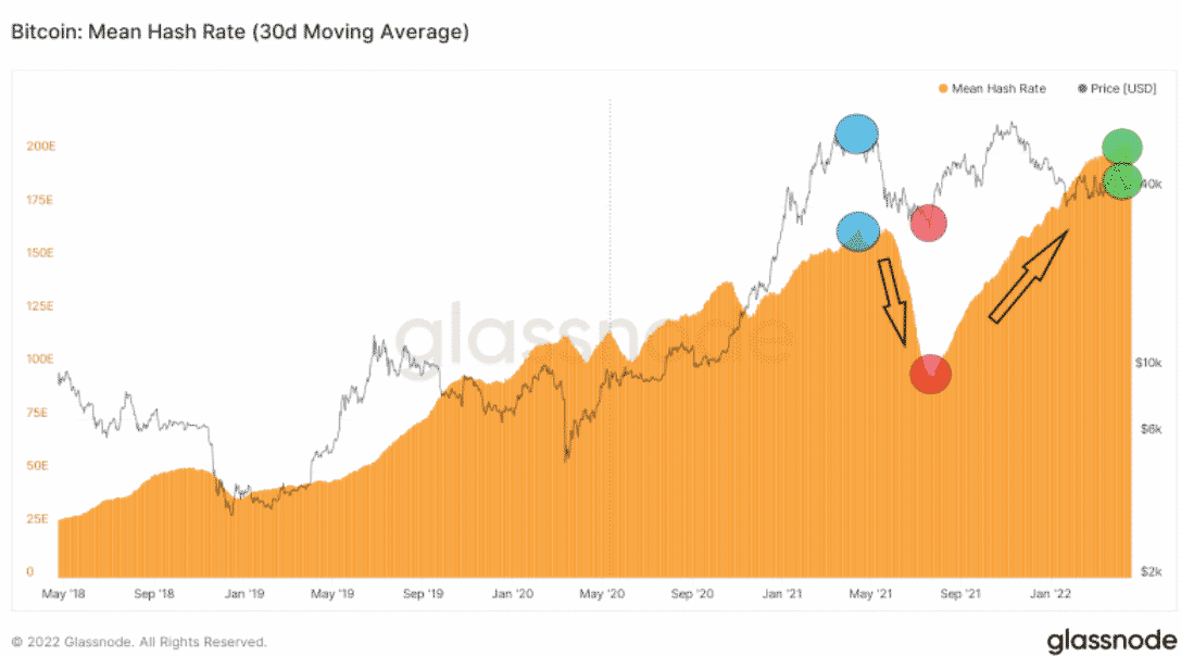 Odvtedy sa však hash rate neustále zvyšuje a láme nové historické rekordy. Aktuálna hodnota 30-dňového kĺzavého hash rate v bitcoinovej sieti je 204 EH/s. To je o 23 % viac ako predchádzajúci ATH, napriek tomu, že Bitcoin má dnes cenu okolo 39 500 $ (zelené krúžky).