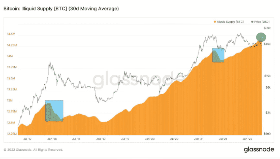 Zaujímavé je, že nelikvidná ponuka naďalej rastie počas súčasnej korekcie ceny Bitcoinu a tento rast sa zrýchlil len v posledných dvoch mesiacoch. V súčasnosti je už takmer 14,5 milióna BTC považovaných za nelikvidných (zelený kruh).