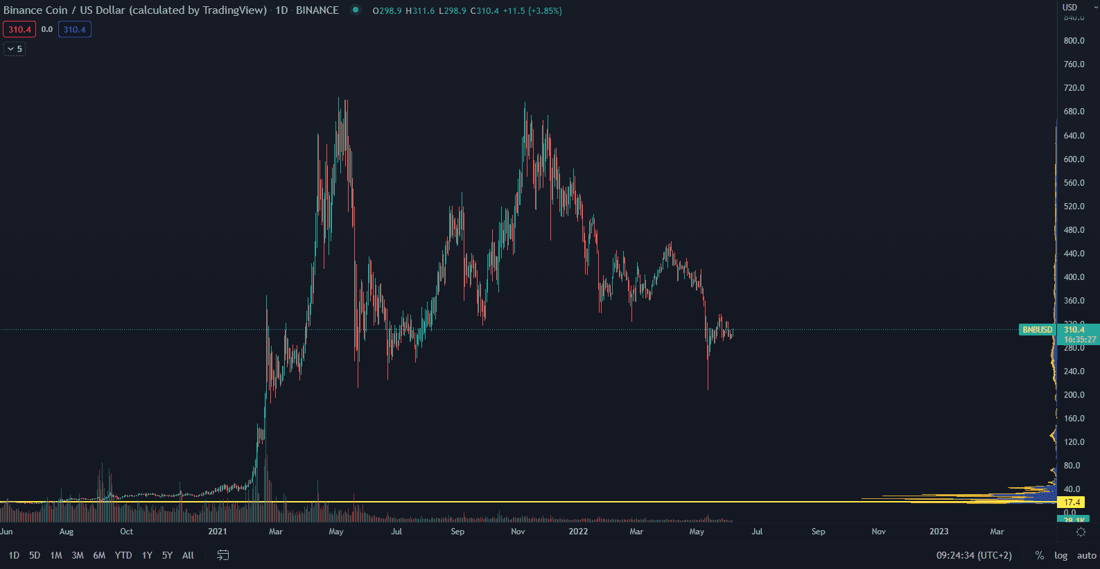 Ich token BNB klesol s trhom kryptomien a momentálne je veľmi zľavnený na úrovni okolo 310 $. Keď sa trh zotaví, cena BNB môže ľahko dosiahnuť predchádzajúcu cenu 600 $, čo predstavuje ďalšiu 100 % návratnosť.