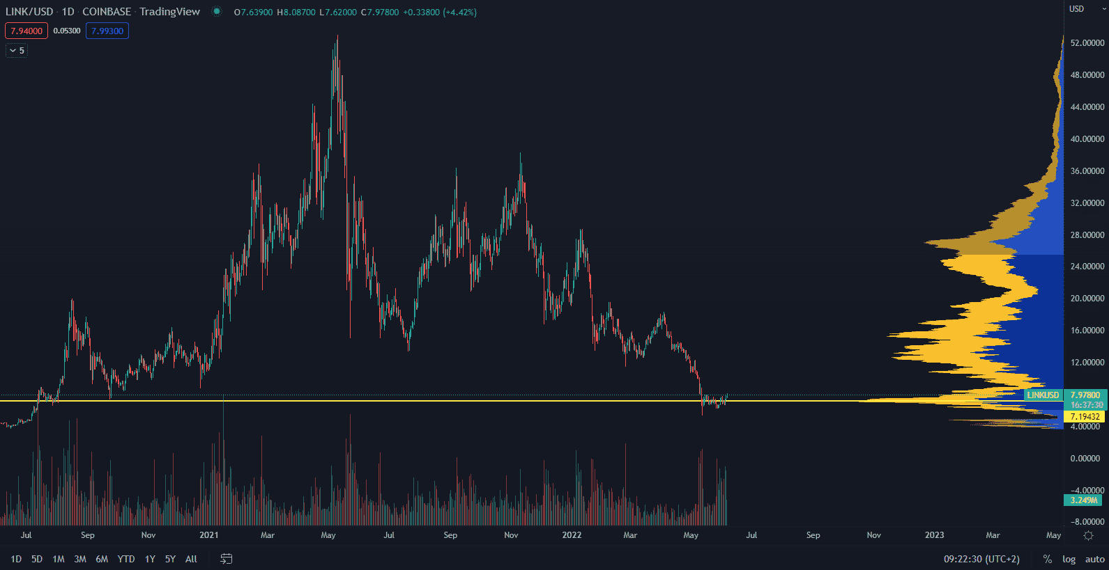 Dnes je cena tokenu LINK výrazne zľavnená a dosiahla aktuálne 8 $. Ak sa kryptomenový trh odrazí vyššie, cena LINK môže ľahko dosiahnuť svoj ďalší cieľ 14 $, čo predstavuje takmer 100 % návratnosť.