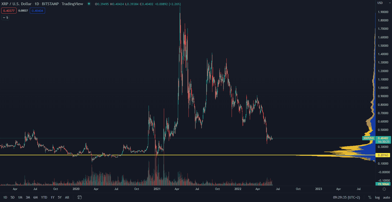 Cena XRP klesla pod cenovú hranicu 0,50 $ 10. mája 2022 a v súčasnosti sa obchoduje za 0,40 $. Celý kryptomenový trh sa zrútil a teraz je príležitosť nakupovať lacno s potenciálnym targetom na 0,60 $.