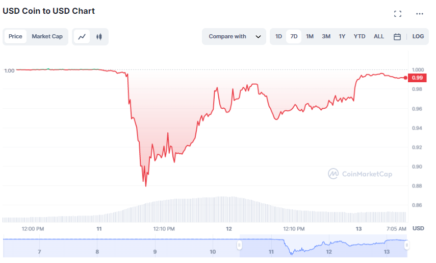 Obchodné platformy ako Coinbase, Crypto.com alebo Binance okamžite reagovali pozastavením obchodovania s USDC, ktorý sa prepadol až na úroveň 0,88 dolára 11. marca 2023.