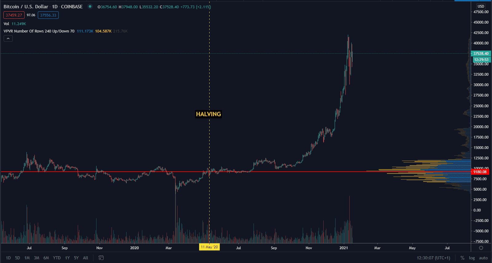 Spoluzakladateľ spoločnosti Morgan Creek Digital Anthony Pompliano označil halving ako udalosť s najväčším účinkom na cenovú akciu. „Prichádzajúca denná ponuka sa znížila a dopyt sa výrazne zvýšil, čo viedlo k zvýšeniu ceny v USD,“ uviedol Pompliano.
