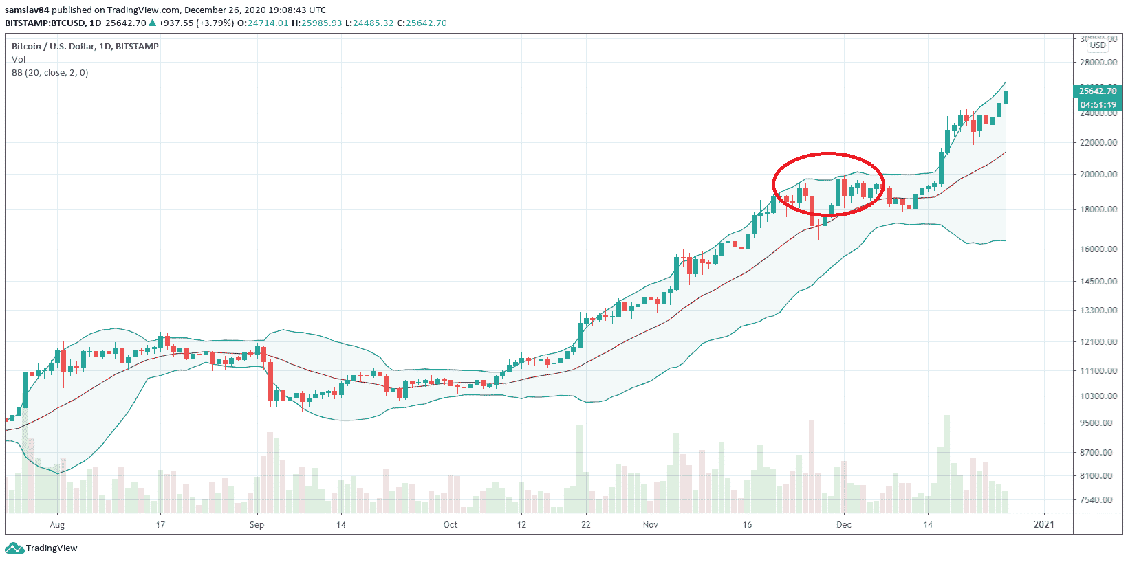 Bollinger Bands je skvelý indikátor, ktorý za normálnych okolností dáva spoľahlivé indície, kedy je čas nakúpiť, či predať. žiadny indikátor však nie je dokonalý. Všetky trhy sú v roku 2020 absolútne nepredvídateľné a pre Bitcoin to platí dvojnásobne. Táto kryptomena na konci novembra úplne odignorovala pána Bollingera, ktorý ohlásil, že zaznamenal ukážkový TOP setup a má prísť korekcia.
