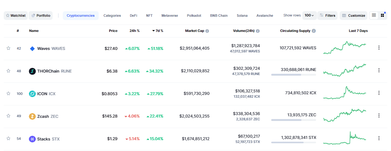 Napriek tomu, že sa stále kryptomeny nepozreli na rastúce maximá a krátkodobá budúcnosť ziskov je nejasná, našlo sa niekoľko kryptomien, ktoré dosahovali dvojciferné zisky. Nasledujúca tabuľka zobrazuje týchto top 5 ziskových kryptomien za posledný týždeň.