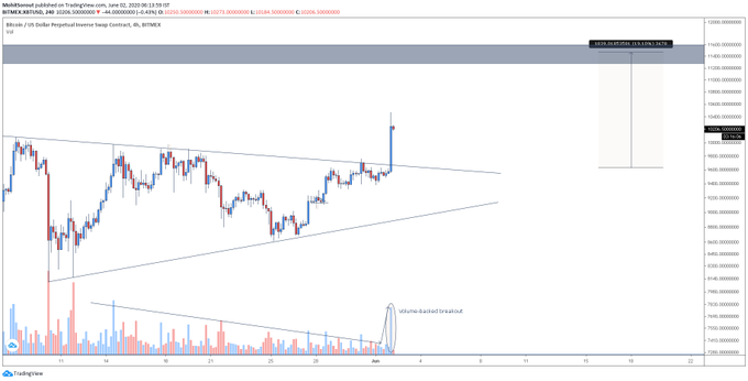 Bitcoin prerazil vrchnú hranu a navyše sa dostal nad 10 000 $, čo je veľmi dôležitá technická úroveň. Navyše, tento breakout je podporený obrovským volume. Býci tak podľa Mohita spravili rozhodujúci pohyb a očakáva, že rast bude pokračovať. V hľadáčiku má cenu 11 500 $.