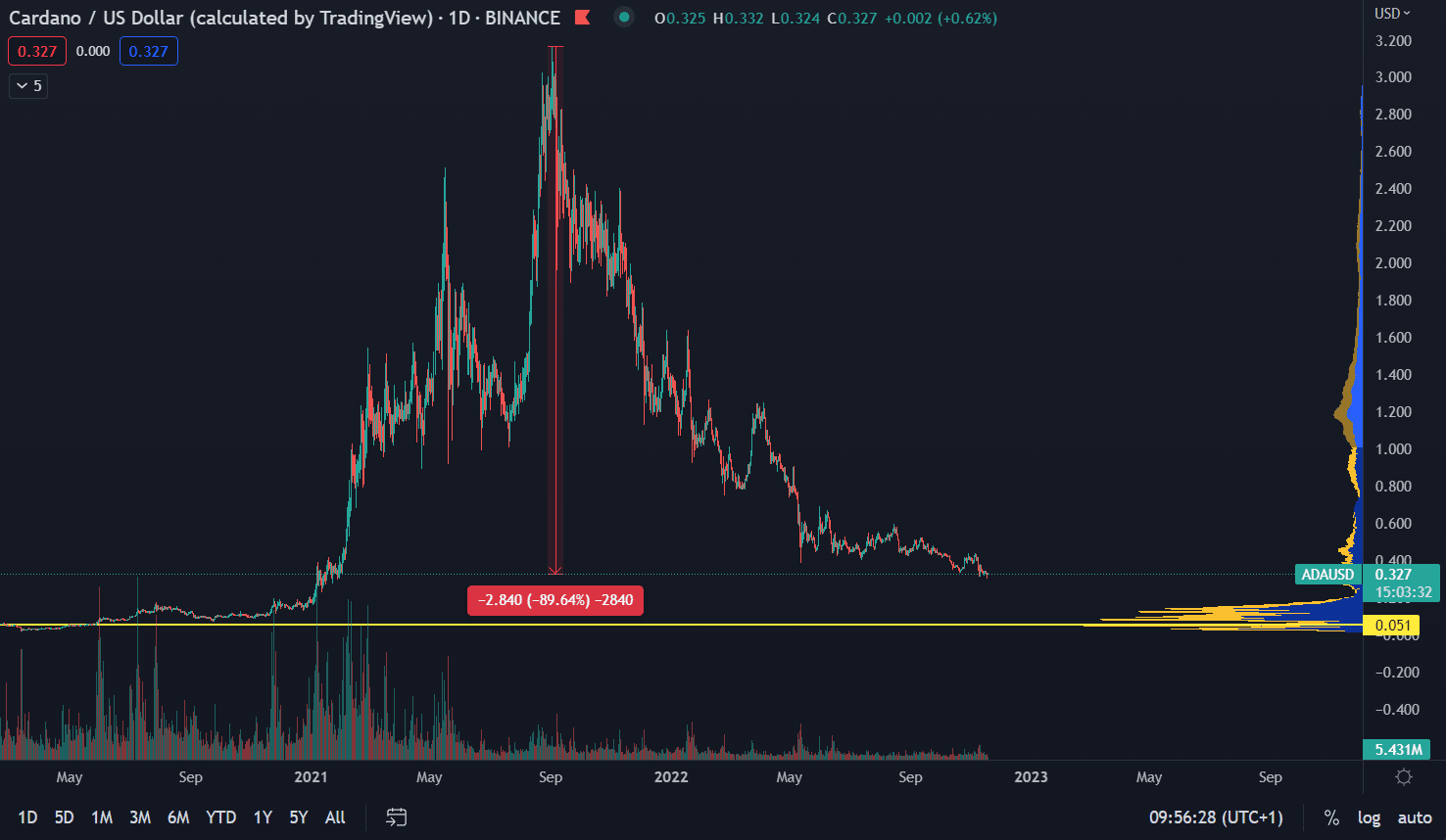 Ako vidíme na grafe nižšie, ADA sa v čase písania článku obchoduje o 90 % nižšie v porovnaní s historickým maximom dosiahnutým na úrovni 3,16 dolárov. Trhová cena na hodnote 0,32 dolára bola naposledy dosiahnutá počas januára 2021 a nachádza sa na takmer dvojročnom minime.