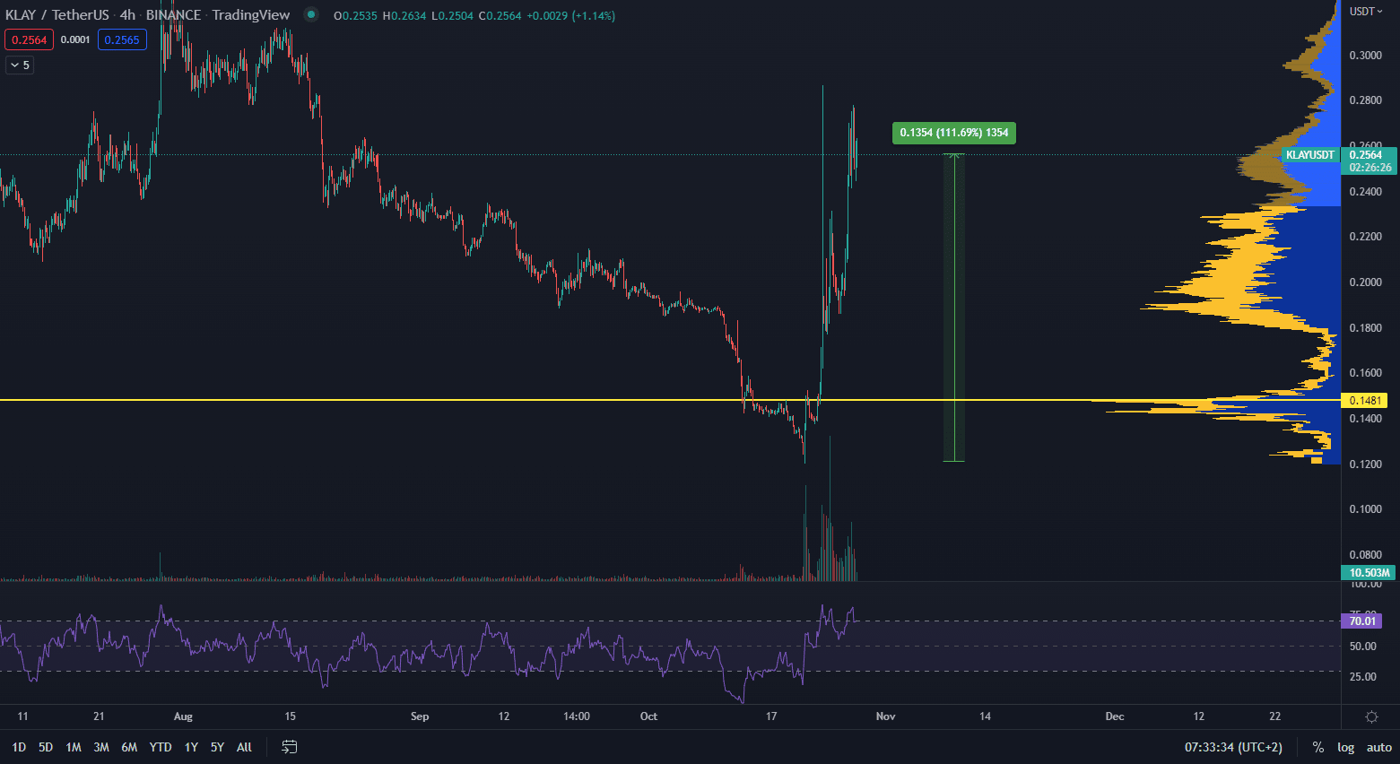 Ako vidíme na grafe nižšie, cena KLAY vystrelila 22. októbra a v súčasnosti sa pohybuje o približne 110 % vyššie. Najvyšší bod tohto rastu dosiahol zhodnotenie až 135 %. Okrem toho bol rast podporený aj objemami a zdá sa, že nekončí. Napriek tomu je vysoko rizikové vstupovať do takto rozbehnutého trendu.
