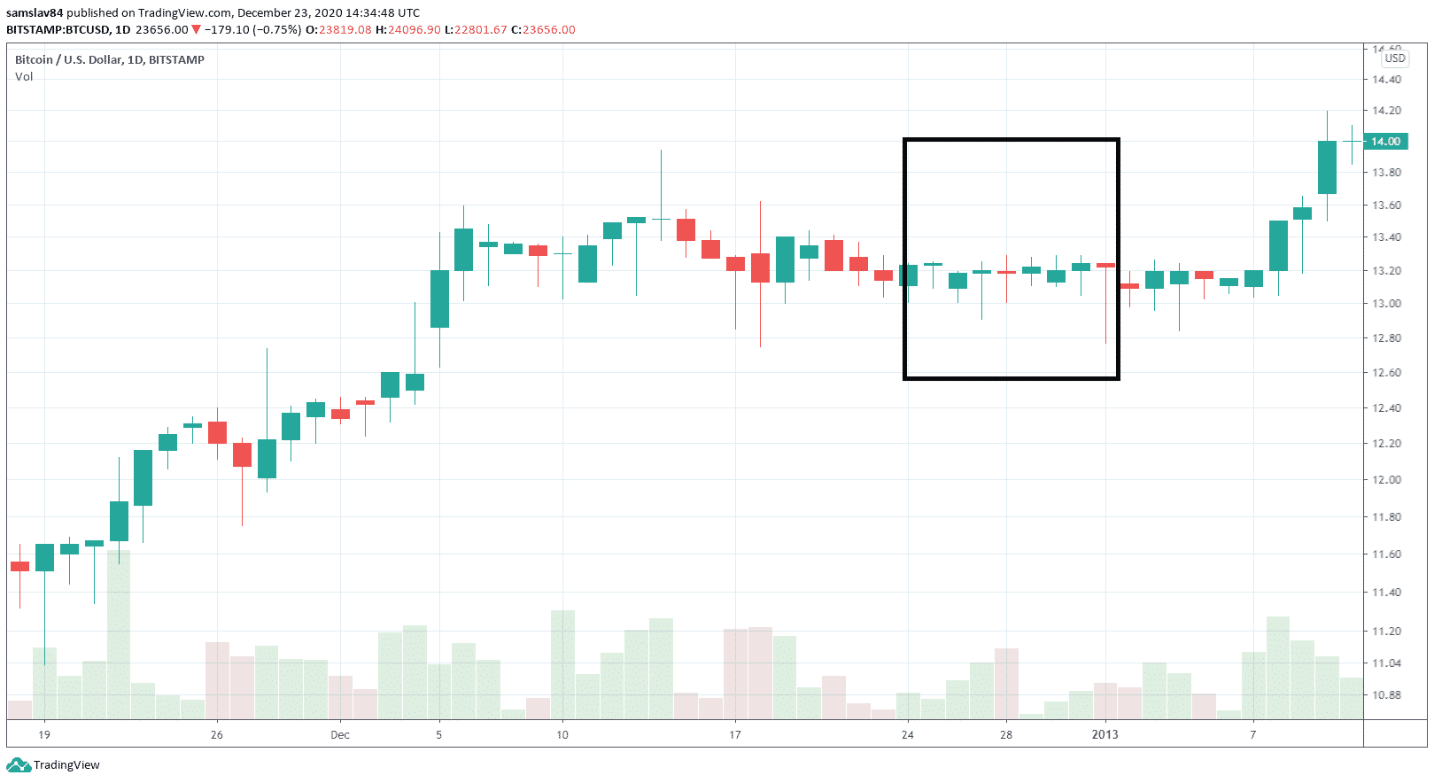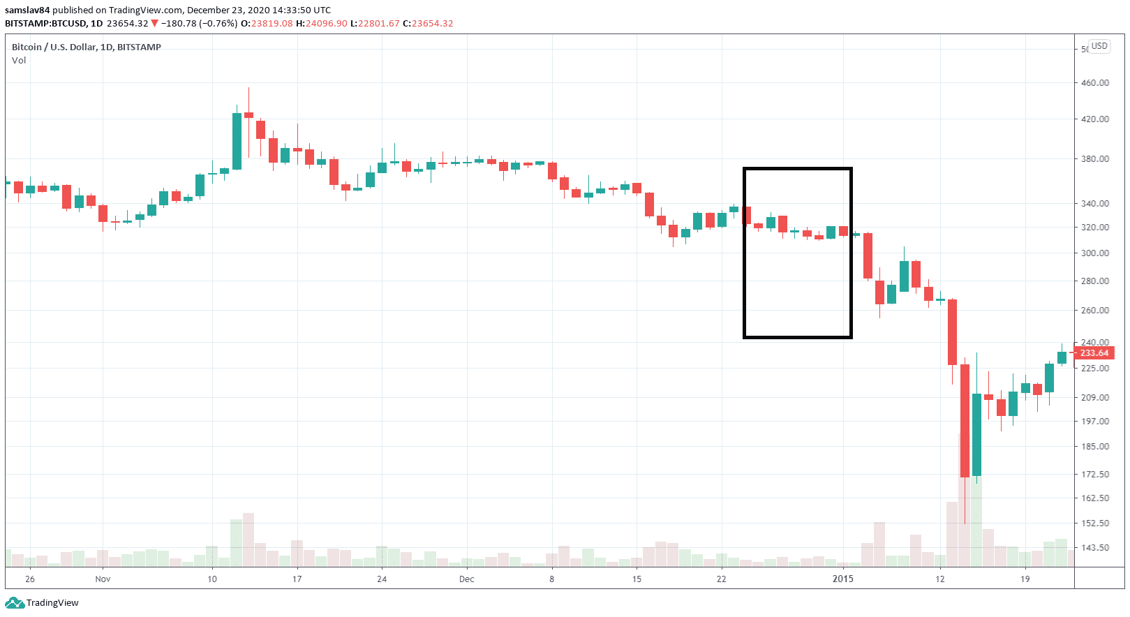 Trh s kryptomenami sa dnes opäť tlačí smerom hore a Bitcoin pred necelú hodinou otestoval hladinu 24 000 $. Na chvíľu ju dokonca prerazil, no veľmi rýchlo sa stiahol späť a trh tak ďalej konsoliduje v intervale 23 000 – 24 000 $. Ale ak si myslíte, že na trhu vydrží vianočná pohoda, môžete byť poriadne sklamaní. Pohľad do histórie, aj aktuálne fundamenty, skôr nahrávajú zvýšeniu volatility a možno aj koncoročnému dumpu.