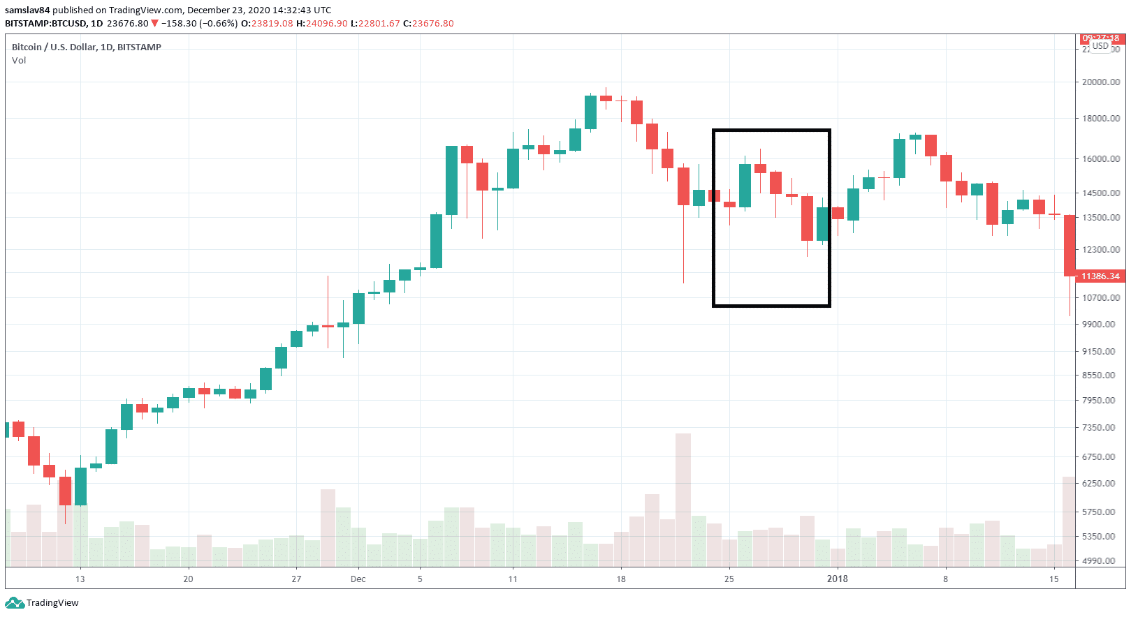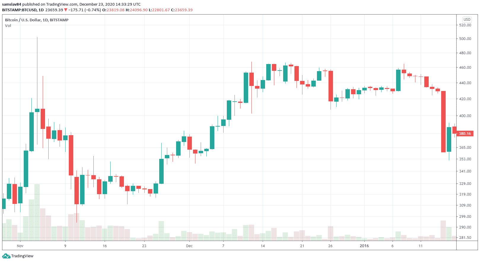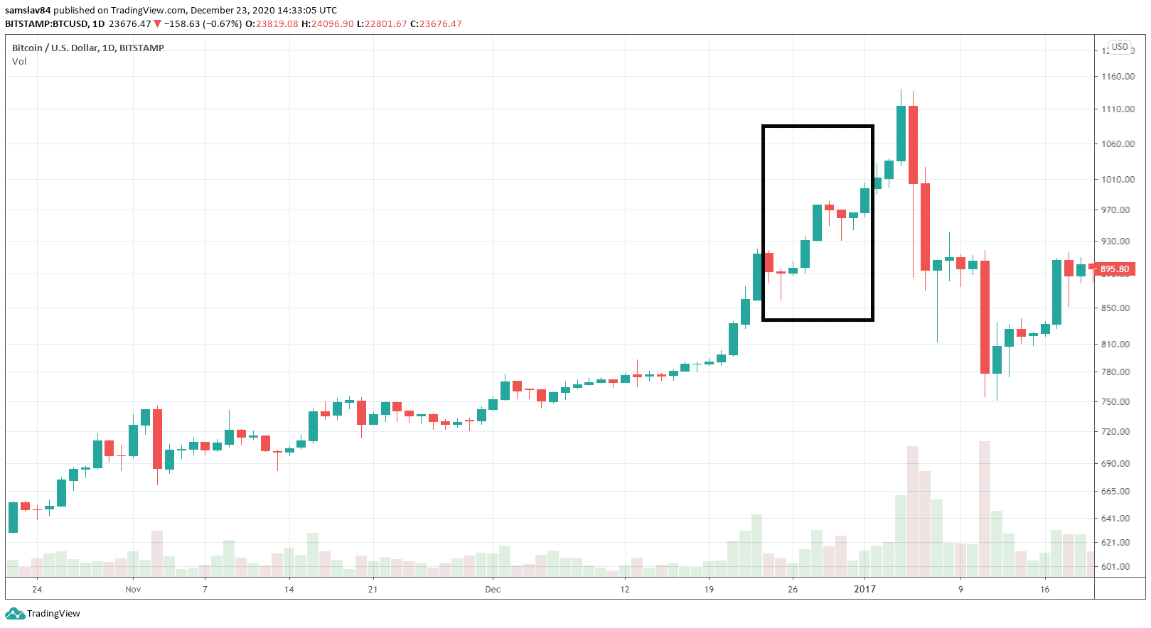 I keď, ako môžete vidieť, koncoročný prepad nie je pravidlo. Z pohybov v minulých rokoch však vyplýva, že by mohlo dôjsť ku korekcii o 3-6%. Ak sa tak naozaj stane, Bitcoin klesne na 21 000 – 22 000 $. Ešte je vhodné dodať, že na konci roka 2016 Bitcoin stúpal.