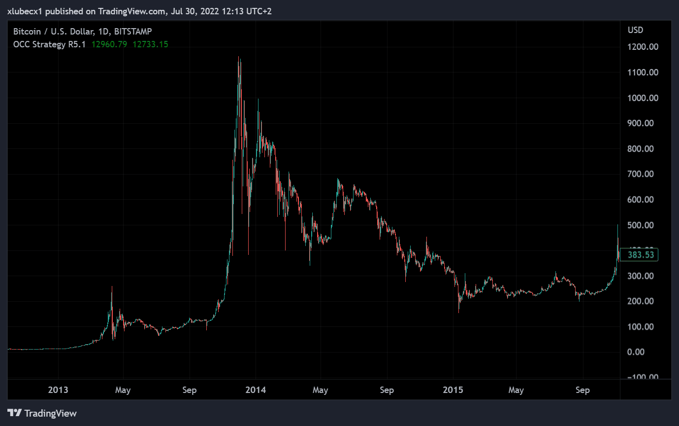 Pád Bitcoinu v roku 2014. Zdroj: tradingview.com