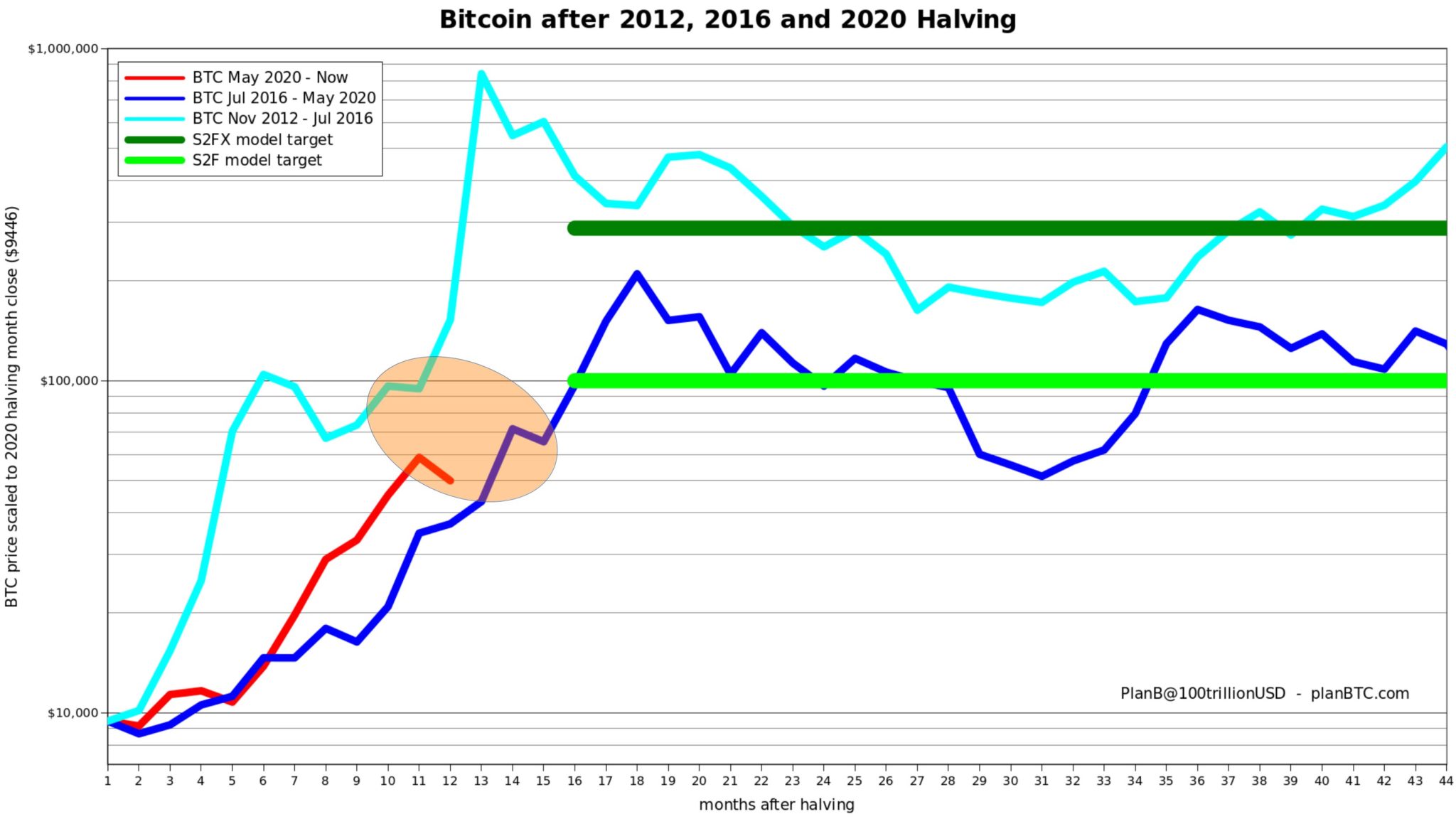 PlanB model je často považovaný aj ako za halvingový model, pretože porovnáva aktuálny halvingový cyklus s predchádzajúcimi. Ako môžeme vidieť na grafe, tak červená čiara predstavuje aktuálny cyklus. Ak by sme brali do úvahy, že tento bullish cyklus bude veľmi podobný ako tie minulé, tak ani na 100 000 USD sa Bitcoin nemusí zastaviť. Cielený target pre tento cyklus je 100 000 až 300 000 dolárov.