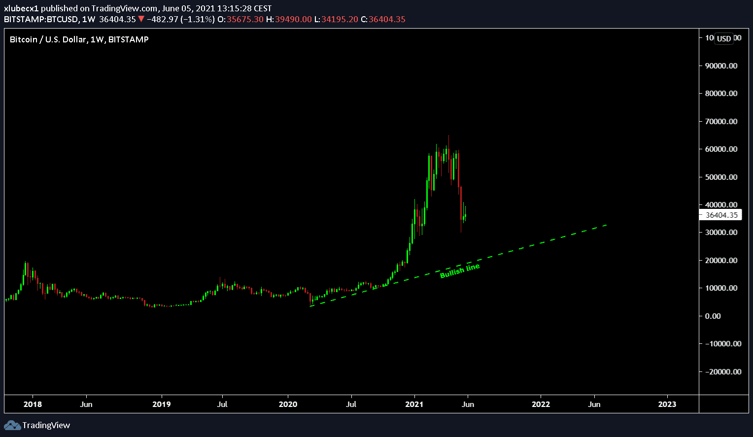 Bitcoin je aj naďalej v bullish trende a neprerazil poslednú dôležitú bullish line, alebo aj čiaru. Aby sme mohli bullish trend podľa tejto technickej analýzy považovať za dokončený, musel by spadnúť pod hodnotu približne 20 000 USD. Vieme z minulosti, že keď príde break out takýchto dôležitých úrovní, Bitcoin obvykle potom nárazovo letí dole. Tak ako tomu bolo nedávno pri prerazení rezistencie z hodnoty 40 000 USD. Prepad sa definitívne zastavil až na 30 000 USD. Teoreticky Bitcoin ešte stále aj v prípade nájdenia nového lokálneho low, ktoré by mohlo byť napríklad na úrovni 25 000 USD nemusí mať dokončený bullish trend.