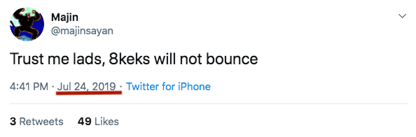 Známy obchodník a postavička na Twitteri s menom Majin sa v minulosti preslávil svojimi presnými predikciami. Naposledy sa mu podarilo s poriadnym predstihom predpovedať utorkový pád Bitcoinu. Vo svojom tweete dňa 26.7. tvrdil, že ani prepad na 8000 $ nebude stačiť a pôjdeme ešte nižšie.