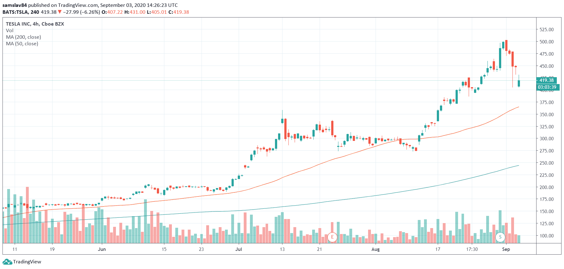 Akcie Tesly sa namiesto za 2000 $ obchodujú za 412. ATH dosiahli 31.8. keď prekročili 500$. V starých cenách by to bolo 2500 $. V prípade Applu je to cca 125 $. Trhová hodnota oboch firiem však tesne pred delením masívne rástla. Hlavne Tesla letela hore nevídaným tempom.