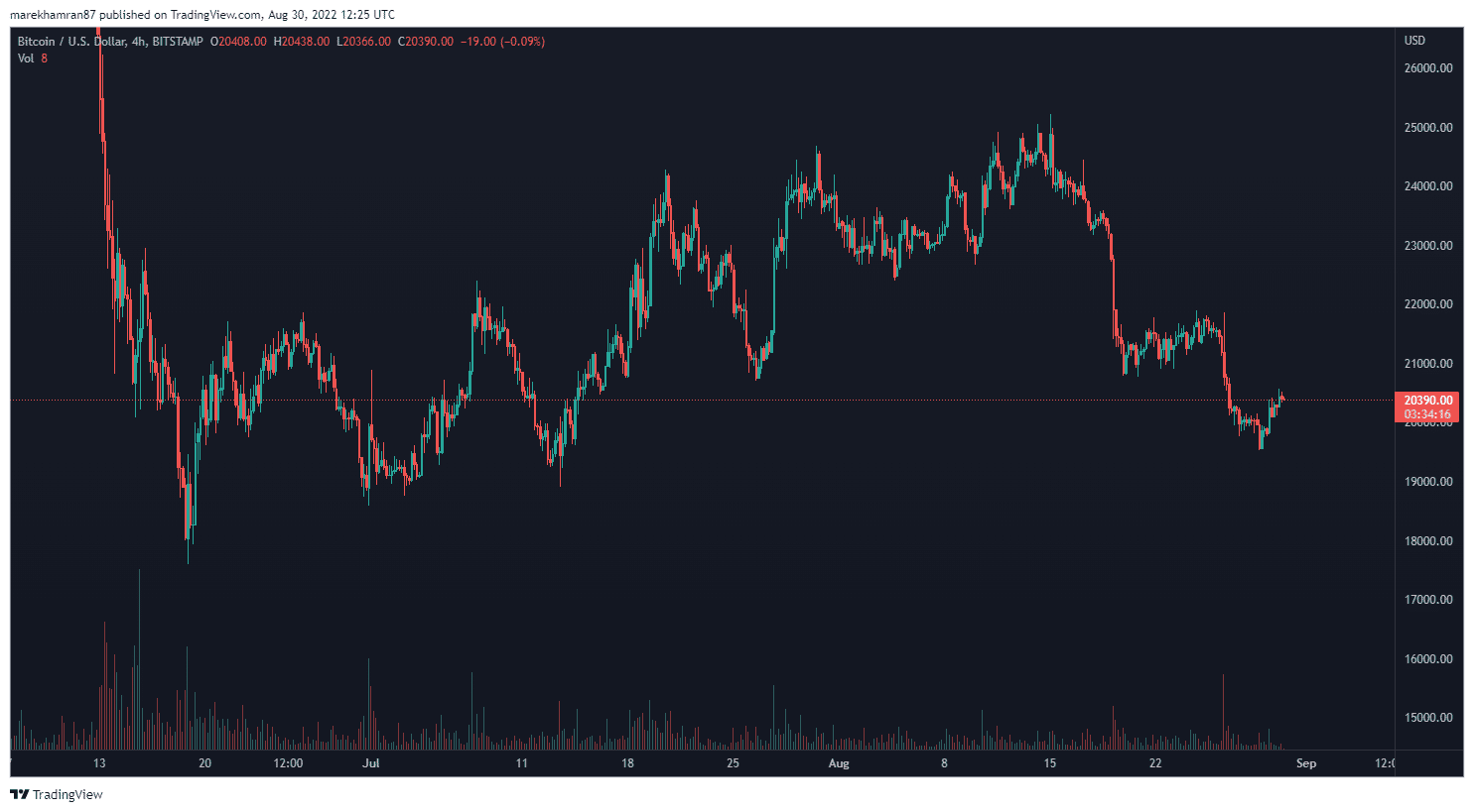 Posledné vyhlásenie predsedu Federálneho rezervného systému Jeroma Powella v Jackson Hole dňa 26. augusta vyvolalo na trhu s kryptomenami ďalší prepad. Ten sa v prípade Bitcoinu ustálil až počas víkendu na cene 19 527 dolárov. V čase písania tohto článku sa BTC úspešne dostal nad dôležitú hranicu 20 000 dolárov, a to konkrétne 20 409 dolárov.