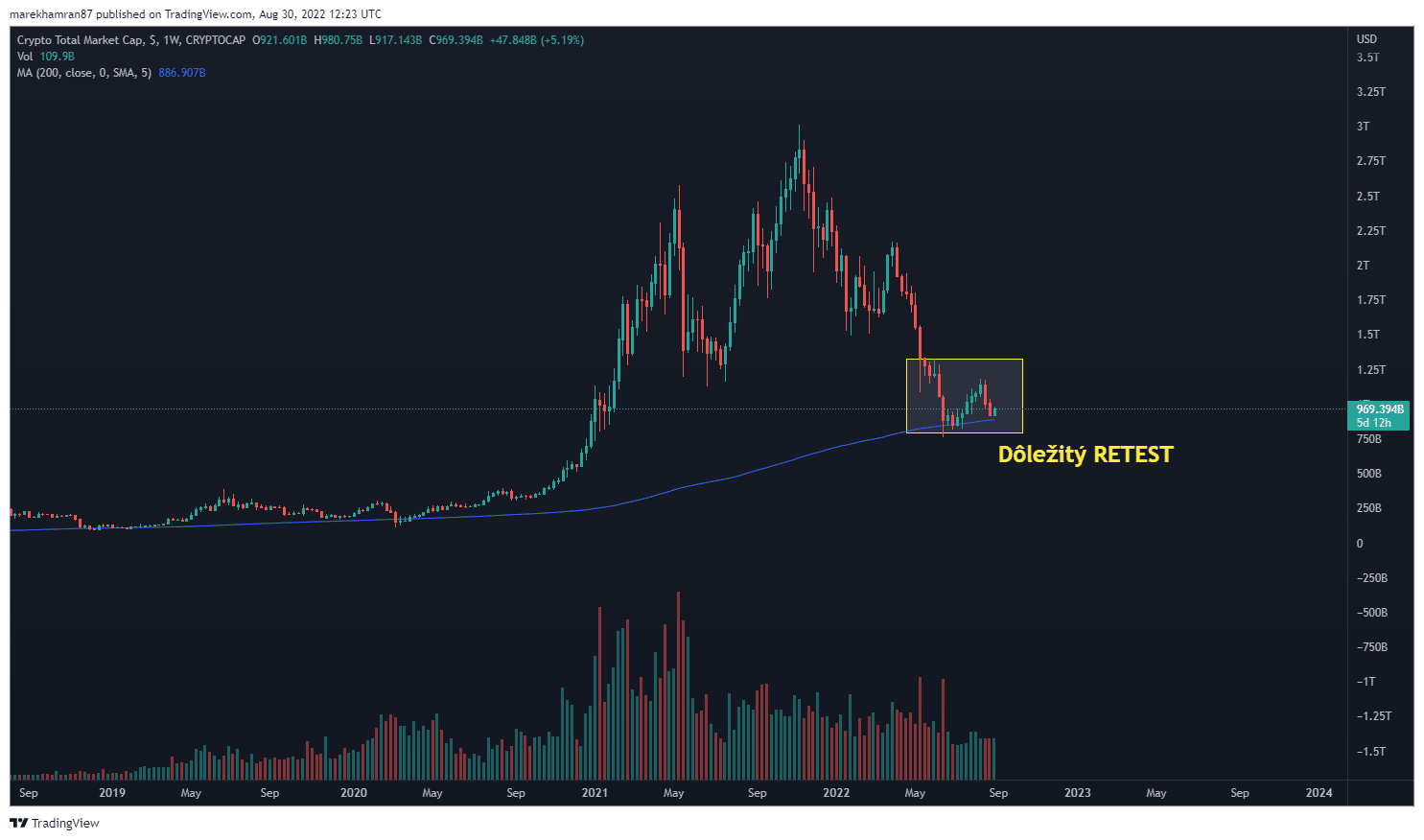 Populárny kryptomenový analytik a obchodník Michaël van de Poppe považuje tento nárast za nebezpečný. Podľa jeho názoru budeme v prípade celkovej trhovej kapitalizácie kryptomien svedkami ďalšieho poklesu na úroveň 200-týždňového kĺzavého priemeru (200 WMA).