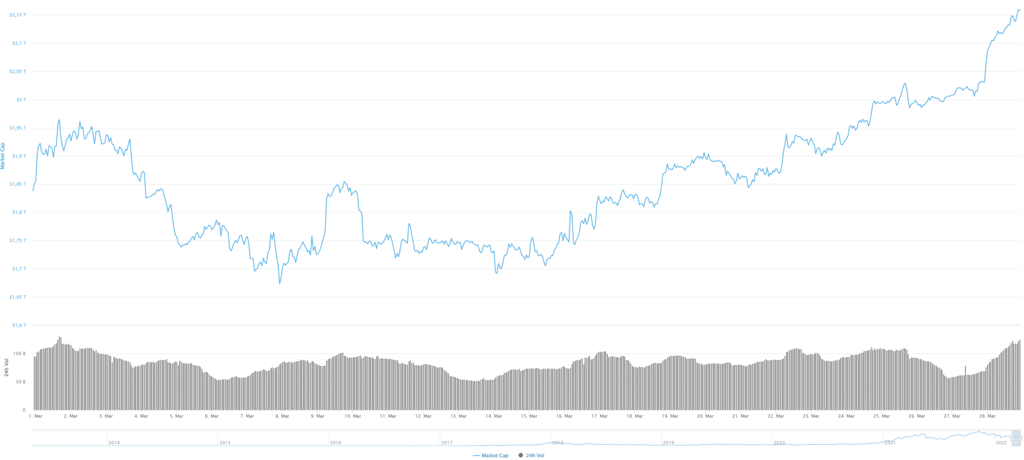 Presne pred mesiacom bola trhová kapitalizácia na úrovni 1,73 bilióna USD. Dnes je to o 23,3 % viac, čiže približne o 403 miliárd USD.