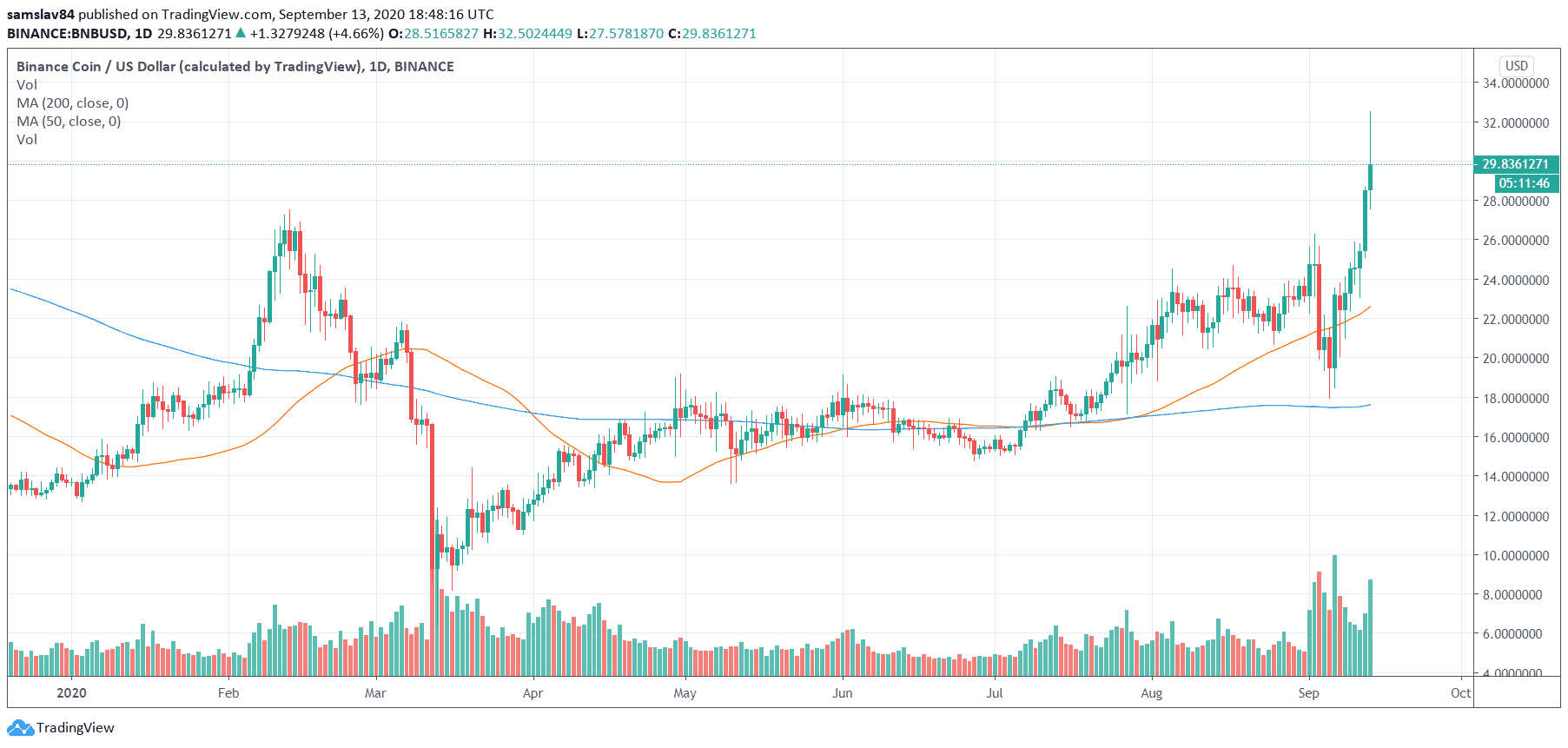 BNB je v súčasnosti najziskovejšou kryptomenou na trhu. Piaty deň po sebe vykazuje zisky a ako prvá prekonala zaváhanie zo začiatku septembra. BNB sa v súčasnosti obchoduje za 30 $, no dnes dosiahla tohtoročné maximum na 32,5 $. Za posledný týždeň tak zaznamenal zisk vo výške 32%.