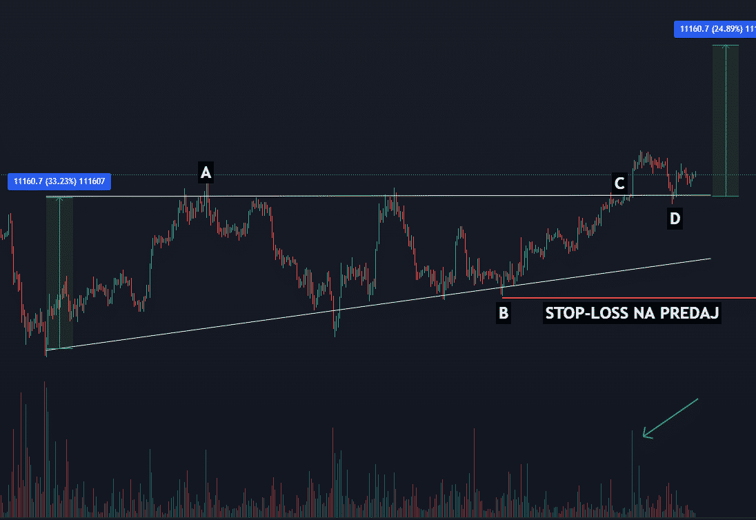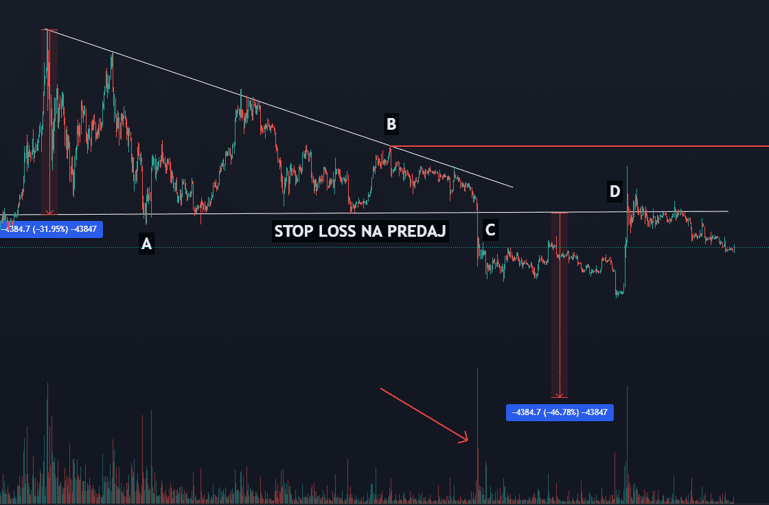 - Bod A – Pod tento bod sa zadáva stop-loss na predaj.