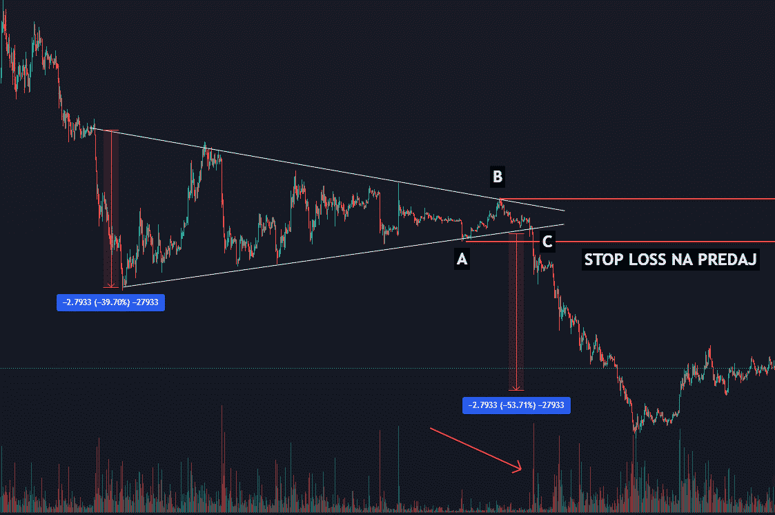 Pozor však na realitu, pretože nie je to pravidlom a hlavne na kryptomenovom trhu sa trojuholníky uzatvárajú rôzne. Preto je obchodovanie trojuholníkov rizikové a dokonca ani prerazenie trendovej čiary nemusí znamenať začiatok nového trendu. Mnohokrát sa udeje situácia, keď cena prekoná trendovú čiaru, no po niekoľkých sviečkach zmení smerovanie. Preto je menej rizikové počkať si na prerazenie najvyššieho maxima trojuholníka alebo minima. Tento postup si ukážeme na ďalších obrázkoch.