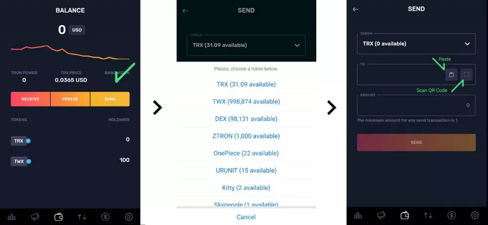 Po kliknutí na ikonku peňaženky v dolnom navigačnom menu zvoľte možnosť „send” (poslať). Aplikácia sa vás opýta, ktorý token chcete poslať, vyzve vás na zadanie sumy a adresy prijímateľa. Tú je možné vložiť buď kopírovaním, alebo pomocou QR kódu. Samotné uskutočnenie transakcie prebehne kliknutím na tlačidlo „send” (poslať).