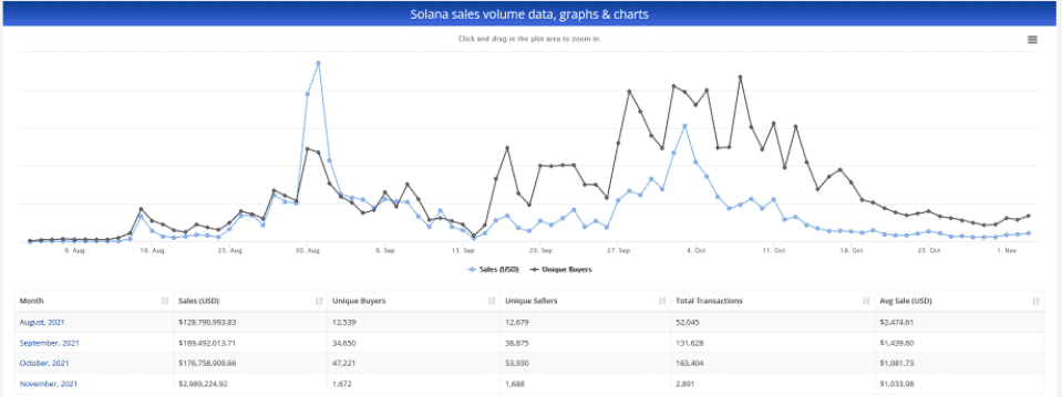 Sekundárny objem predaja NFT na báze SOL dosiahol od začiatku augusta takmer 500 miliónov dolárov. Podľa údajov z CryptoSlam sekundárne predaje Solana NFT vygenerovali k utorku celkovo približne 497,7 milióna USD z približne 348 000 transakcií. Priemerný predaj za NFT bol 1 500 USD.