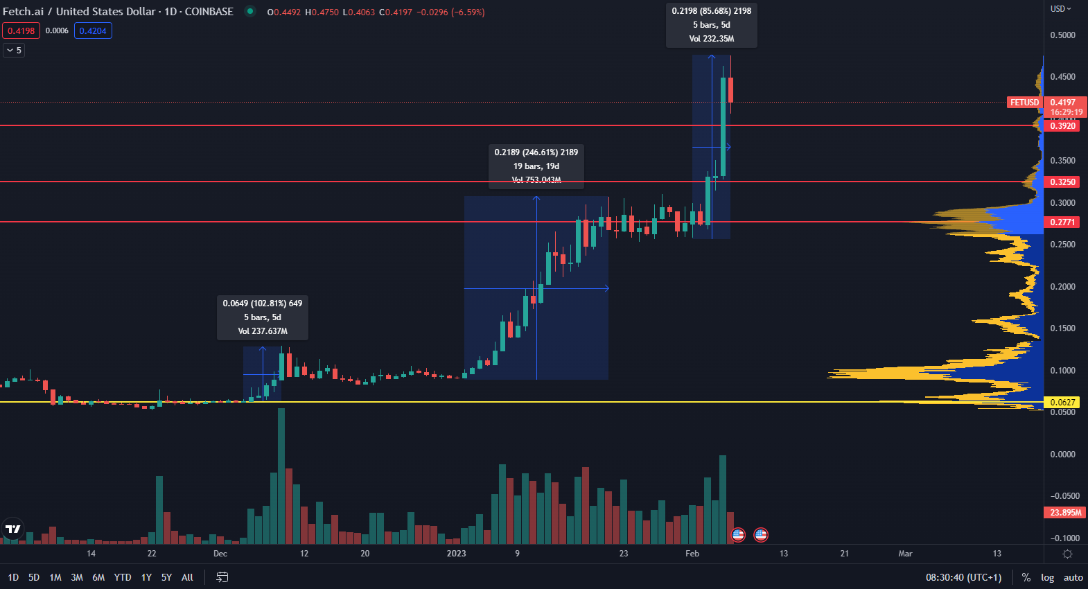 Podľa údajov z TradingView FET narástol v troch po sebe idúcich vzostupov. Len v priebehu februára za posledné dni sa cena zhodnotila o 85 % a z krátkodobého hľadiska konsoliduje. Všeobecne sa odporúča počkať si na spomalenie volatility a keď cena pôjde opäť po korekcii bokom, naskytne sa ďalšia nákupná príležitosť. Viac sa o strachu z premrhanej príležitosti a emočnom obchodovaní môžete dočítať v článku Ako strach a chamtivosť ovplyvňujú naše výsledky na burze.