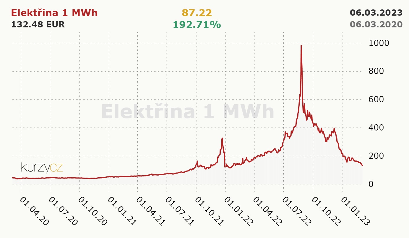 Cena elektriny za posledné 3 roky. Zdroj: kurzy.cz