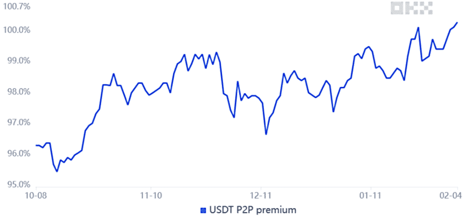 Bez ohľadu na dôvod, prečo Bitcoin (BTC) a Ether (ETH) v piatok narástli o viac ako 10 %, prémia Tetheru (USDT) v OKX dosiahla najvyššiu úroveň za štyri mesiace. Ukazovateľ porovnáva obchody typu peer-to-peer (P2P) v Číne a oficiálnu menu amerického dolára.