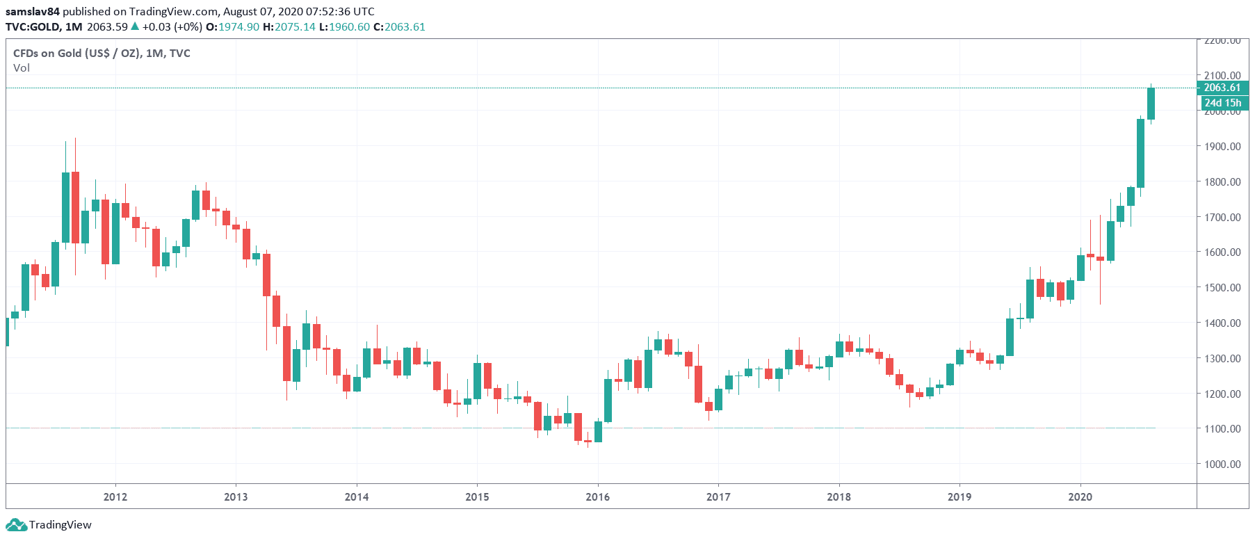Ak bude zlato pokračovať v tomto tempe, v nasledujúcich štyroch rokoch by sa mohlo skutočne dostať na desaťtisíce dolárov za uncu. Tento cenový vývoj je samozrejme podmienený ďalším tlačením peňazí zo strany Fedu a novými vlnami koronavirusu, s ktorými sa americká vláda nebude vedieť vysporiadať.