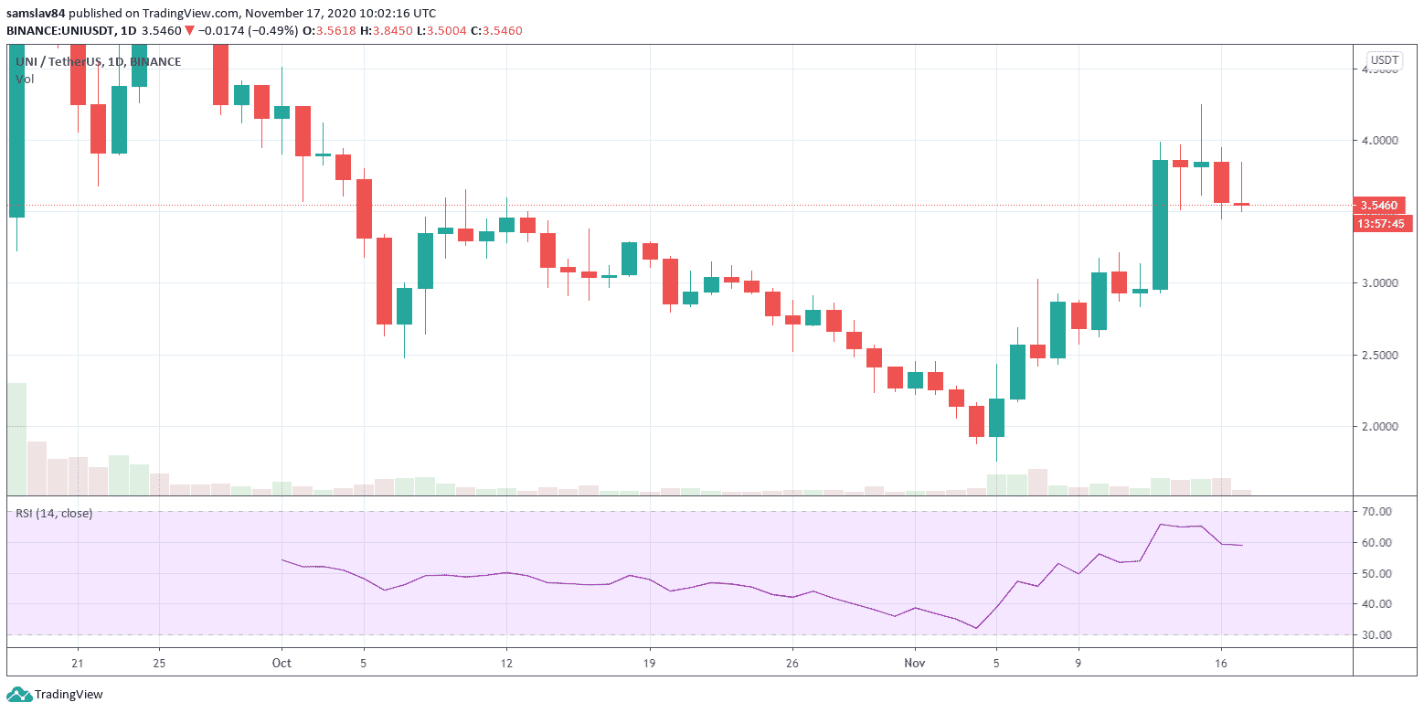 1D UNI/USDT – BinanceJeden token sa dnes na Binance obchoduje za 3,53 $. UNI sa tak dostal nad rezistenciu na hladine 3$, i keď dnes už zaznamenal nepríjemný pokles o 8,5%. Cenu UNI pred piatimi dňami vystrelila správa, že komunita nechce ďalej predlžovať farming.