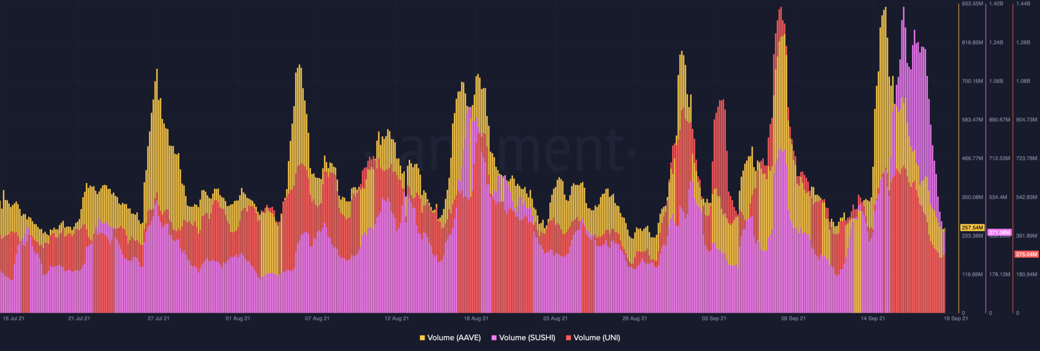 Okrem iného bol pre dané projekty zaznamenaný výrazný nárast objemov obchodovania. Aj to môže zohrávať dôležitú úlohu v krátkodobom horizonte. Ak sa teda pozrieme na možnosť hodlovania týchto tokenov, je to určite jedna z tých lepších možností. Pomer trhovej kapitalizácie voči tzv. TVL bol pre projekty UniSwap, AAVE a SushiSwap na úrovni 2,65, 0,32 a 0,44. Môžeme teda predpokladať, že tieto projekty sú vhodnou voľbou na dlhodobú investíciu.