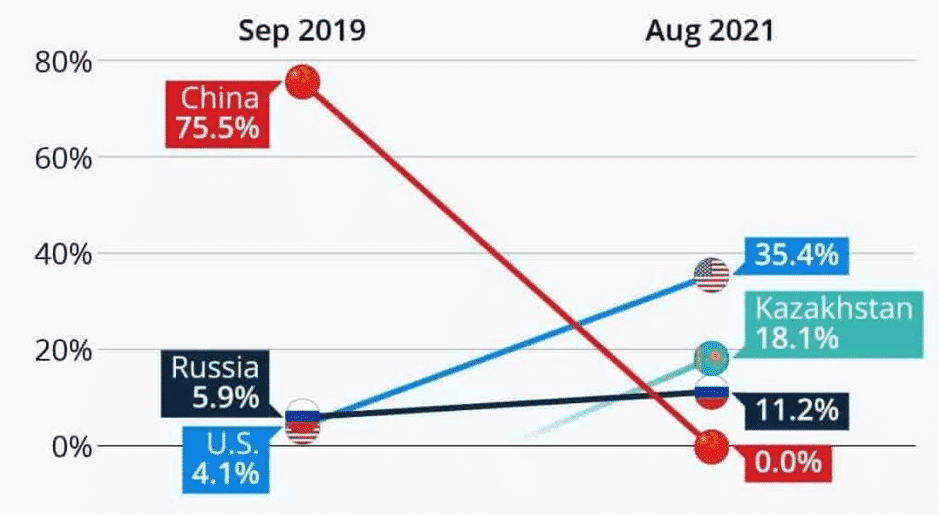 Zaujímavým faktom je, že ťažba Bitcoinu v Číne ešte v septembri 2019 predstavovala až 75,5 % celkovej spotrebovanej počítačovej energie. Tieto časy sú však dávno preč. Krajina radikálne zakázala kryptomeny, čo viedlo k tomu, že podiel alternatívnych financií v Číne sa v lete 2021 dostal na 0 %.
