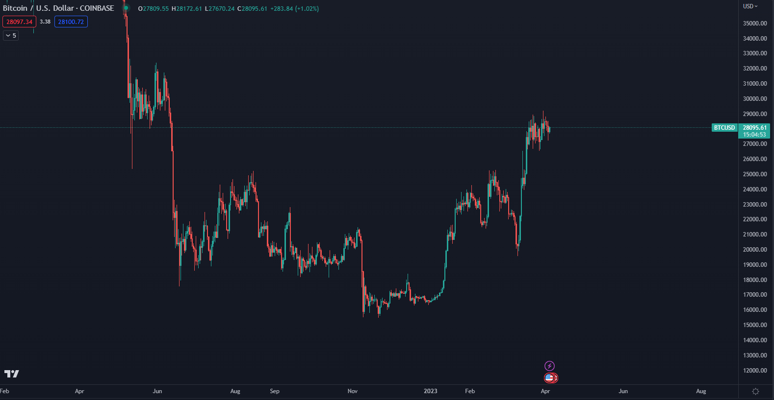 Podľa údajov z CoinMarketCap sa bitcoin obchoduje na trhovej cene 28 081 dolárov a stagnuje na rezistencii, ktorá rozhodne o ďalšom niekoľkotisícovom pohybe. Trhová kapitalizácia dosahuje 542 miliárd dolárov a denný objem obchodovania stúpol o 20 %, na hodnotu 18 miliárd dolárov.