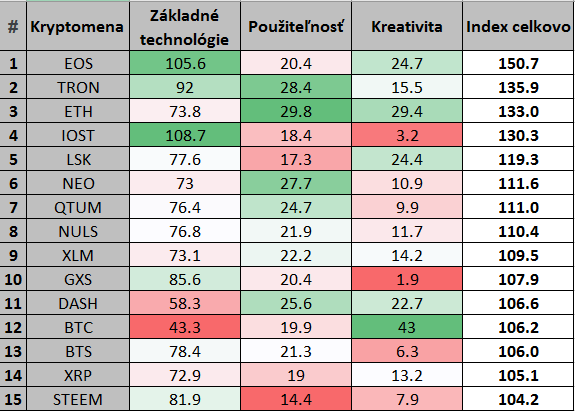 Najhoršie výsledky v oblasti technológií mali BTC, DASH a XRP. V oblasti použiteľnosti to boli STEEM, LSK a IOST. V poslednej oblasti kreativity mali najhoršie výsledky GXS, IOST a BTS.