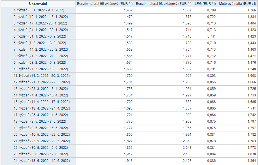 Nižšie môžete vidieť súčasné ceny a ich vývoj od januára 2022. Posledné dva údaje sa medzitýždenne takmer nezmenili a benzín dokonca stagnoval. Pravdepodobne sa tak dočkáme mierneho poklesu cien, čo bude výsledkom klesajúcej ceny ropy.
