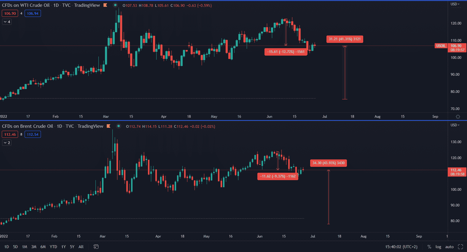 Posledné maximum bolo dosiahnuté 9. júna a odvtedy ceny ropy klesajú. WTI za posledných dva a pol týždňa klesol o takmer 13 % a Brent o vyše 9 %.