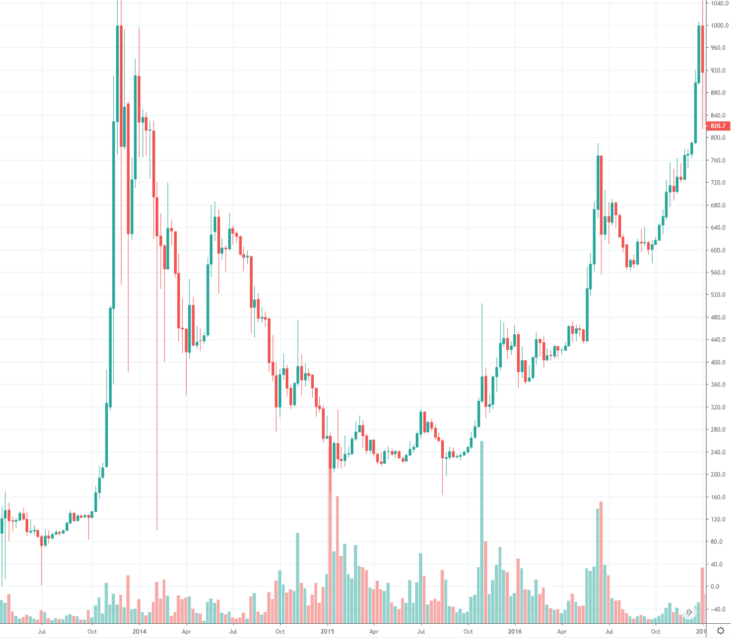 Začnem jedným zaujímavým grafom, ktorý zobrazuje vývoj Bitcoinu v rokoch 2013 – 2017. Tento graf je podľa mňa tak trochu šokujúci. Pravá a ľavá strana sa zľahka zrkadlia.