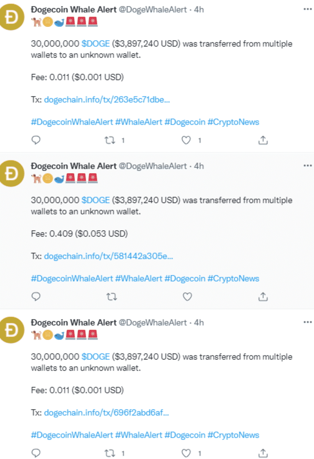 Celkovo sa uskutočnili za posledné dni 20 takýchto transakcií v objeme 30 miliónov dogecoinov. Cena počas dnešného dňa najväčšej meme kryptomeny skôr klesala. Až počas obeda prišiel menší odraz, čím sa podarilo časť z poklesu vymazať. Treba spomenúť, že tieto mince mohli byť kúpené počas tohto týždňa, alebo aj vo veľmi dávnej minulosti. A až teraz sa ich investor rozhodol uschovať na bezpečnú peňaženku. Zároveň mohlo ísť aj o presun mincí na burzy, ktoré môžu byť čoskoro predané. Zaujímavé je aj to, že poplatok vo väčšine prípadov nebol ani jeden cent. A to hovoríme o transakciách, ktoré majú objem niekoľko miliónov dolárov.