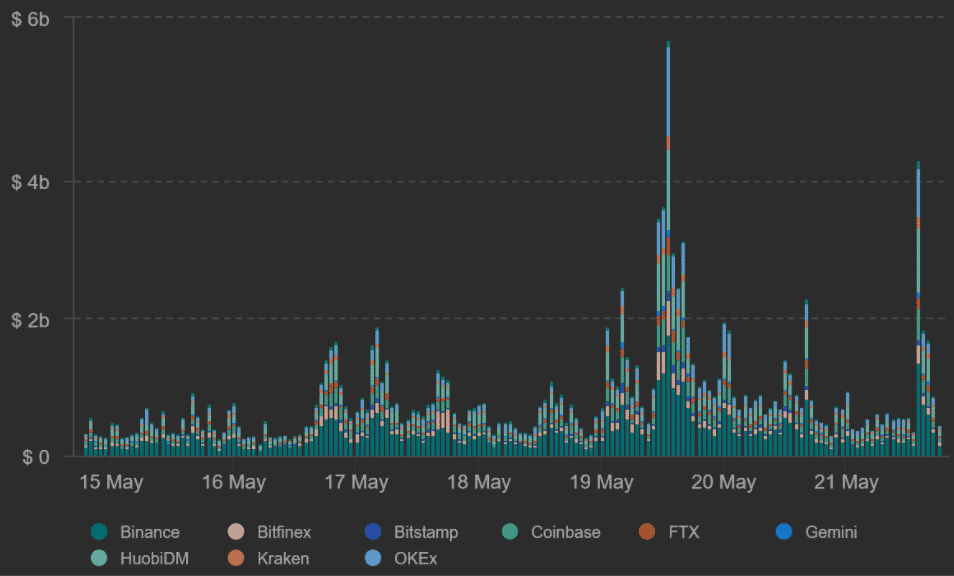 Pri pohľade na vyššie uvedené údaje by nemalo byť pochýb o tom, že veľryby a tvorcovia trhu 21. mája agresívne kúpili pokles vo výške 36 200 dolárov. Spotové výmenné objemy prekonali za štyri hodiny 5,6 miliárd dolárov, čo je extrém aj pri 12% pohybe cien.
