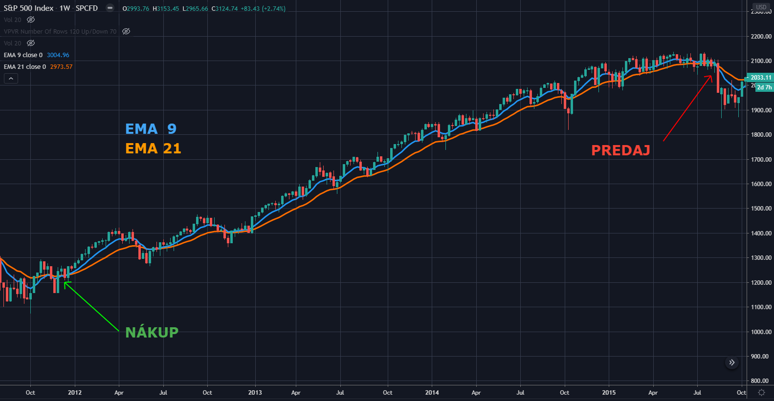 Budeme používať dva exponenciálne kĺzavé priemery – 21 a 9-týždňový. Niekedy sa oplatí dať prednosť EMA 6 pred 9 ale na dlhodobé obchody lepšie funguje perióda 9. Perióda EMA hovorí o tom, koľko posledných sviečok sa počíta do výpočtu, pričom najväčšiu váhu má tá posledná a najmenšiu tá prvá z radu. Dole sa pozeráme na graf S & P 500 od roku 2011 po 2015. Vidíme iba 1 signál nákupu a predaja. Pozor – táto stratégia funguje hlavne pri silnejších trendoch.