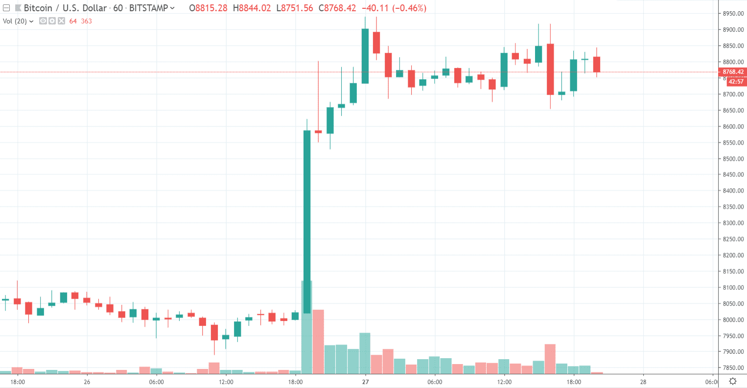 To čakal iba málokto. Bitcoin týmto pohybom prerazil rezistenciu na hladine 8400 $ a má voľnú cestu k 10 000 $. Čo však reálne spôsobilo včerajšiu pumpu? Nejaká manipulácia? To nie.