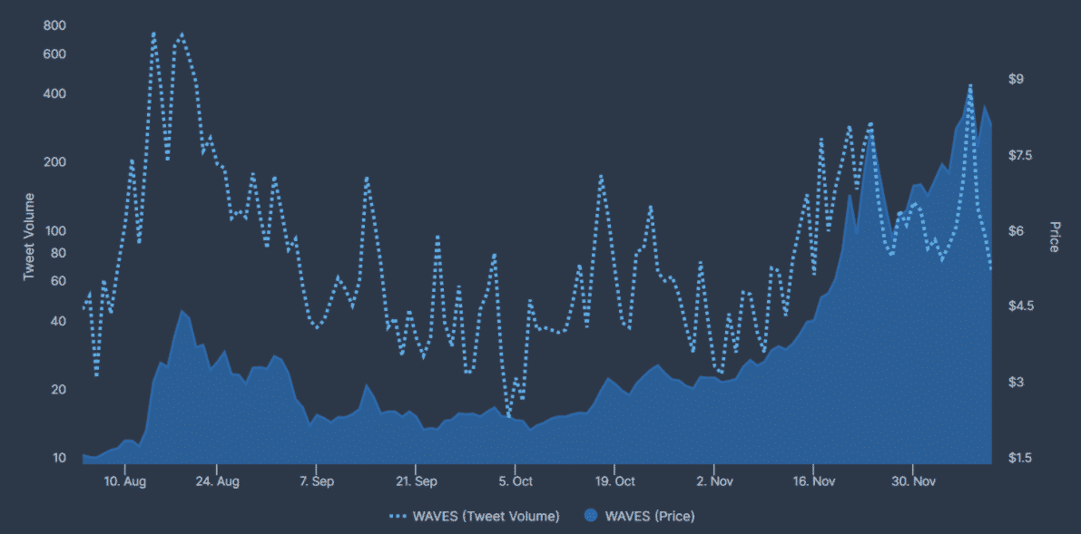 V prvých mesiacoch roku 2020 sa zdalo, že Waves nie je dobrá investícia. Cena tokenu rástla pomalšie ako Ethereum a v jednom momente za druhým najväčším coinom zaostávala o 36%. V posledných mesiacoch sa však všetko zmenilo. Cena Waves v priebehu novembra vzrástla z 3 $ na 8,5 $ a tento týždeň napriek negatívnemu sentimentu na trhu dosiahla troj-ročné maximum na cene 9,5 $. Pre zaujímavosť, v čase najväčšej slávy v decembri 2017 cena tokenu dosiahla 19,2 $.