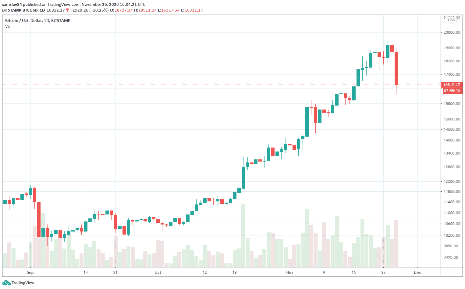 Podobne to vyzeralo aj na ďalších platformách s BTC derivátmi. Tieto likvidácie svojím objemom pripomínajú veľký prepad z marca, keď Bitcoin klesol až na 3700 $. Fakt, že dnes prepad skončil na 16 320 $, jasne ukazuje, že záujem o Bitcoin je podstatne väčší a bullish sentiment sa na trhu drží aj napriek dnešnej korekcii.