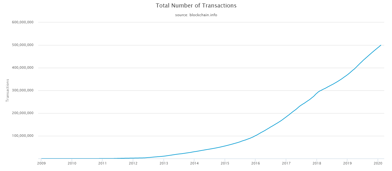 Za celú dobu fungovania Bitcoinu bolo poslaných päťsto miliónov transakcií. Krásne okrúhle číslo, však? Bitcoinu gratulujeme k úspechu!
